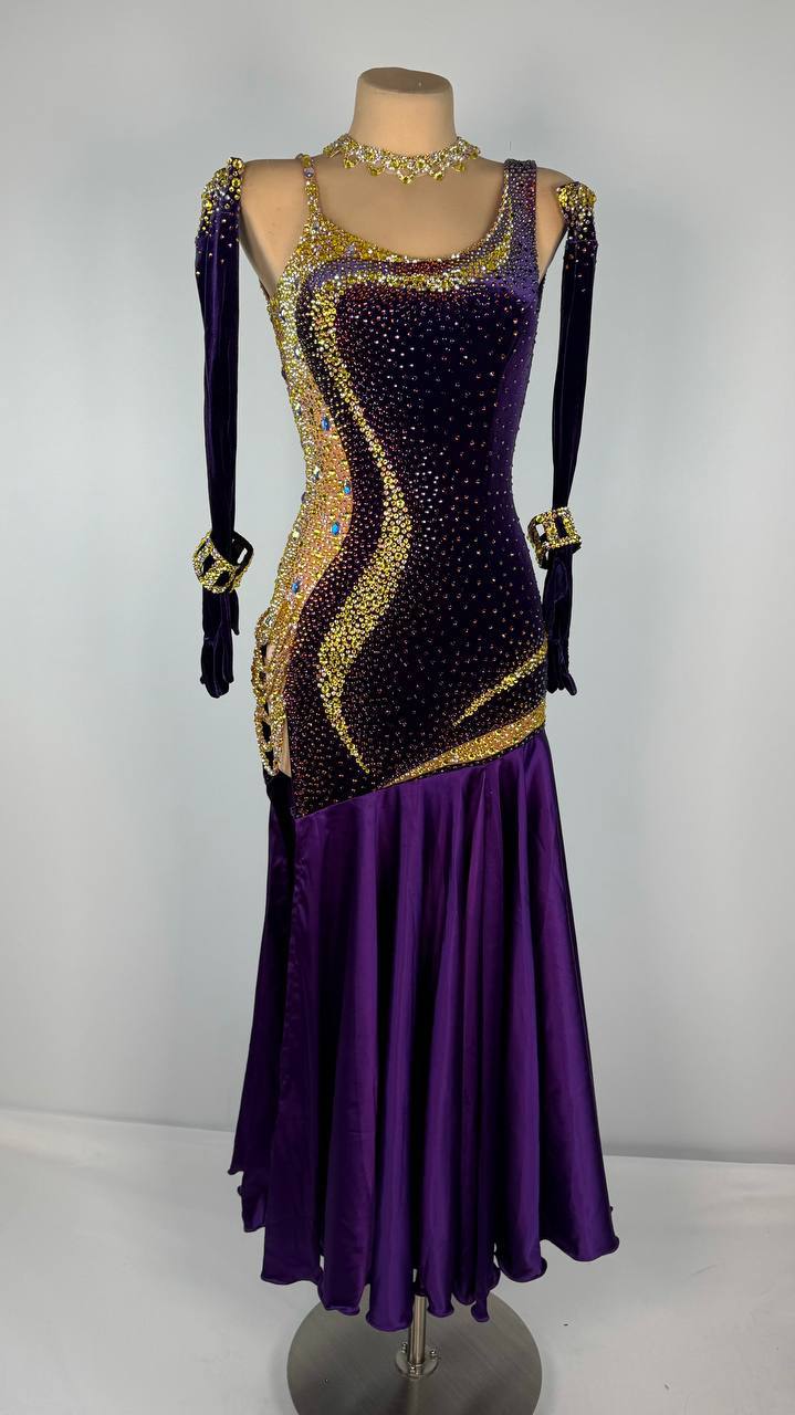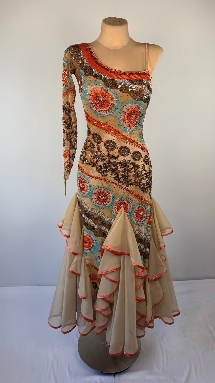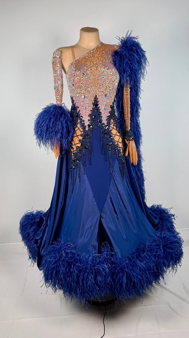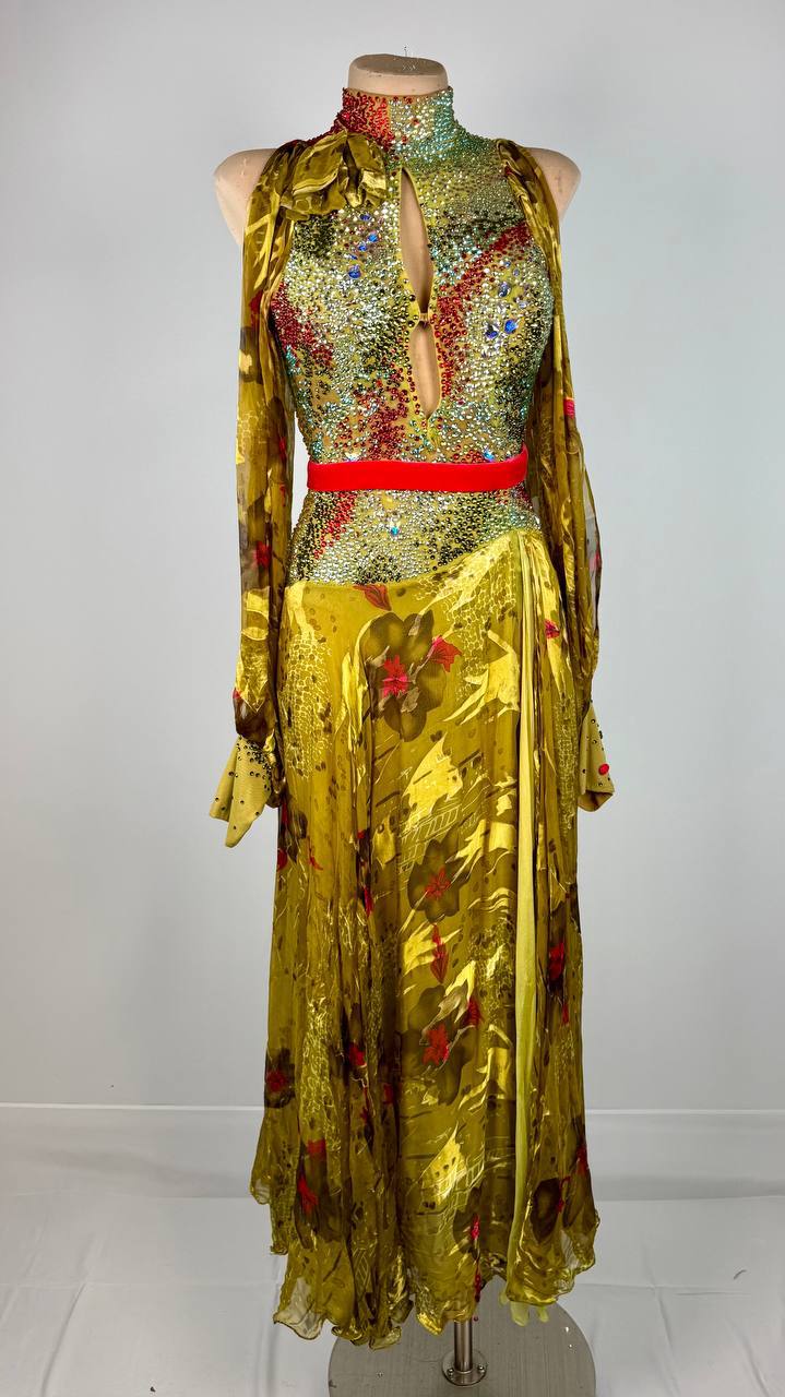 Thoughtfully altered by DanceDiscover for a perfect fit, this AD original offers both artistry and function. Whether you're gliding across the ballroom or striking a dramatic pose, the gown’s flowing lines and sparkling embellishments ensure you're unforgettable.