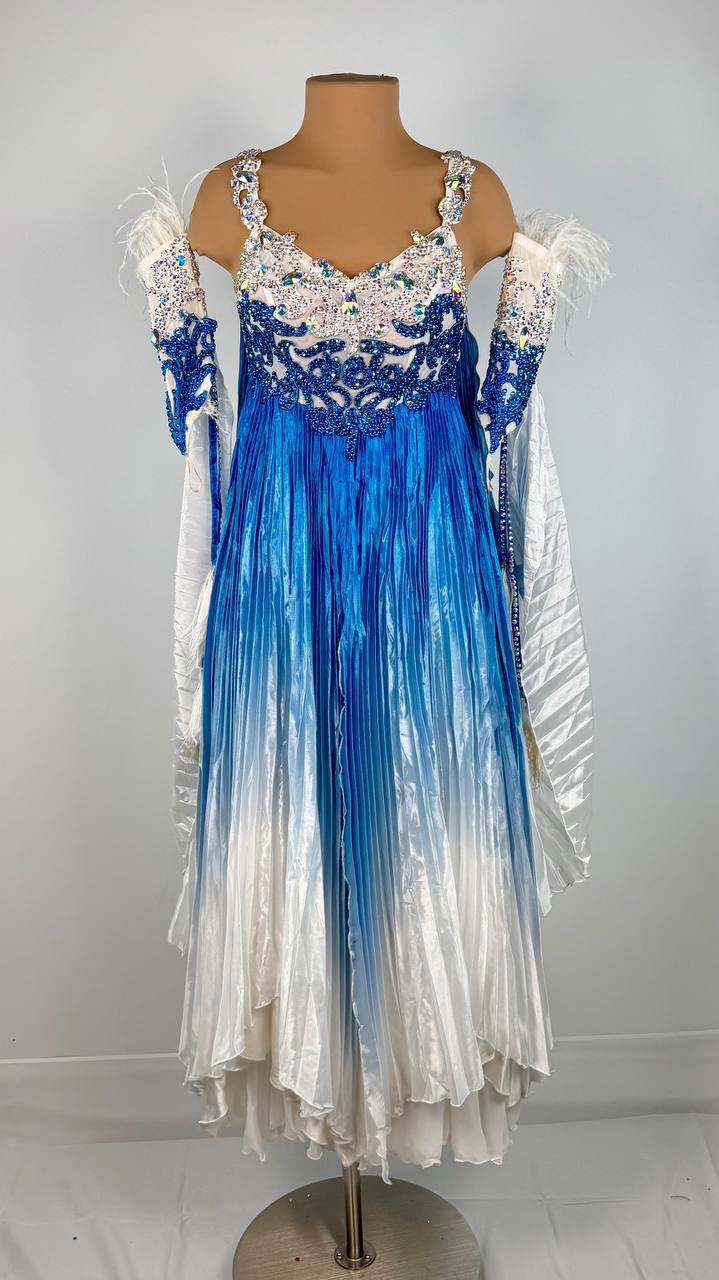 Thoughtfully altered by DanceDiscover for a perfect fit, this AD original offers both artistry and function. Whether you're gliding across the ballroom or striking a dramatic pose, the gown’s flowing lines and sparkling embellishments ensure you're unforgettable.