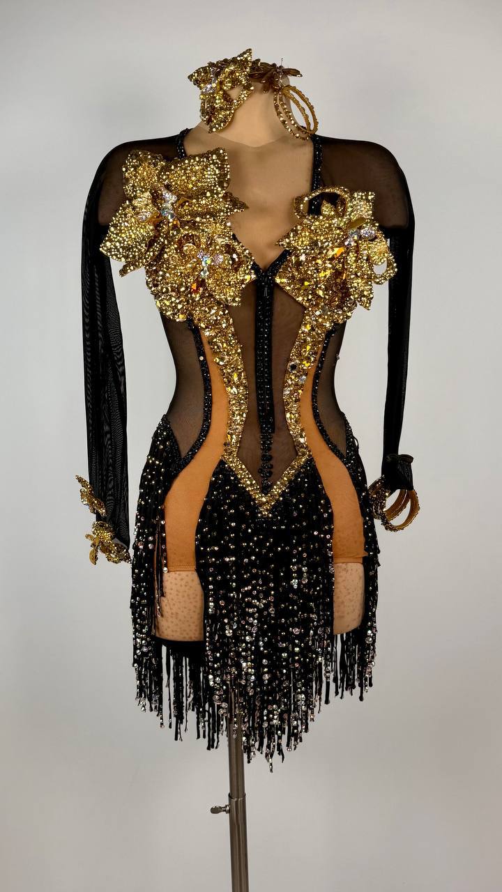 Radiate pure allure in this elegant, floral, and radiant Golden Flower ✨ – Latin/Rhythm Dress by Grand Amour. A stunning fusion of black and gold, this breathtaking piece is meticulously crafted from luxurious mixed fabrics and adorned with high-quality stones that catch the light with every move...