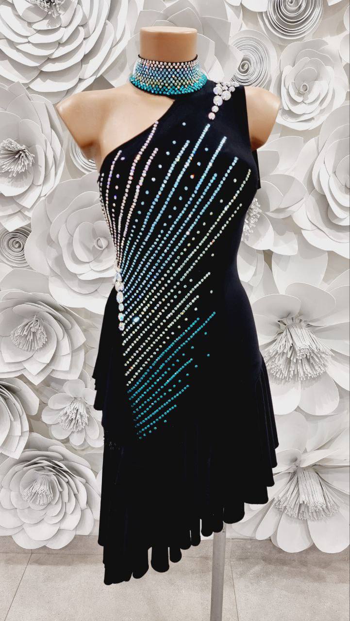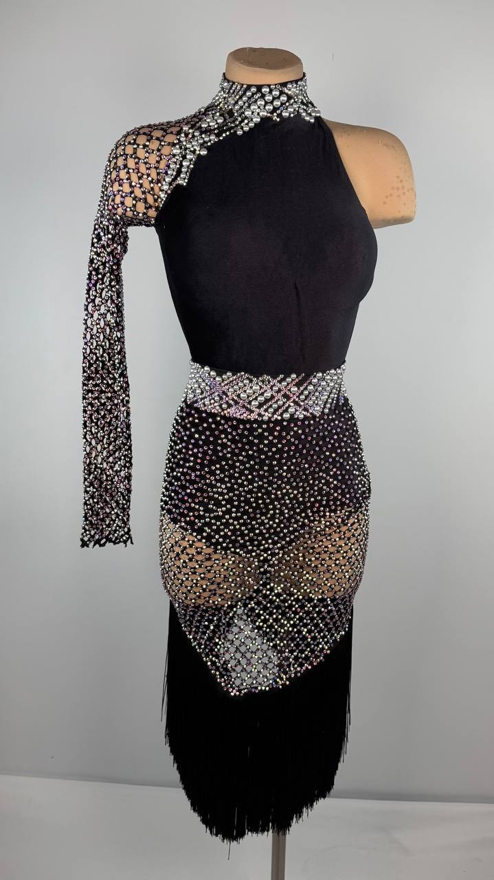 Sultry. Elegant. Unforgettable. Radiate confidence and allure in this mesmerizing Dark Pearl Latin/Rhythm Dress, a masterpiece of sophistication and power.Expertly crafted from mixed fabrics and adorned with high-quality rhinestones, this stunning black creation sparkles with mystery and elegance...