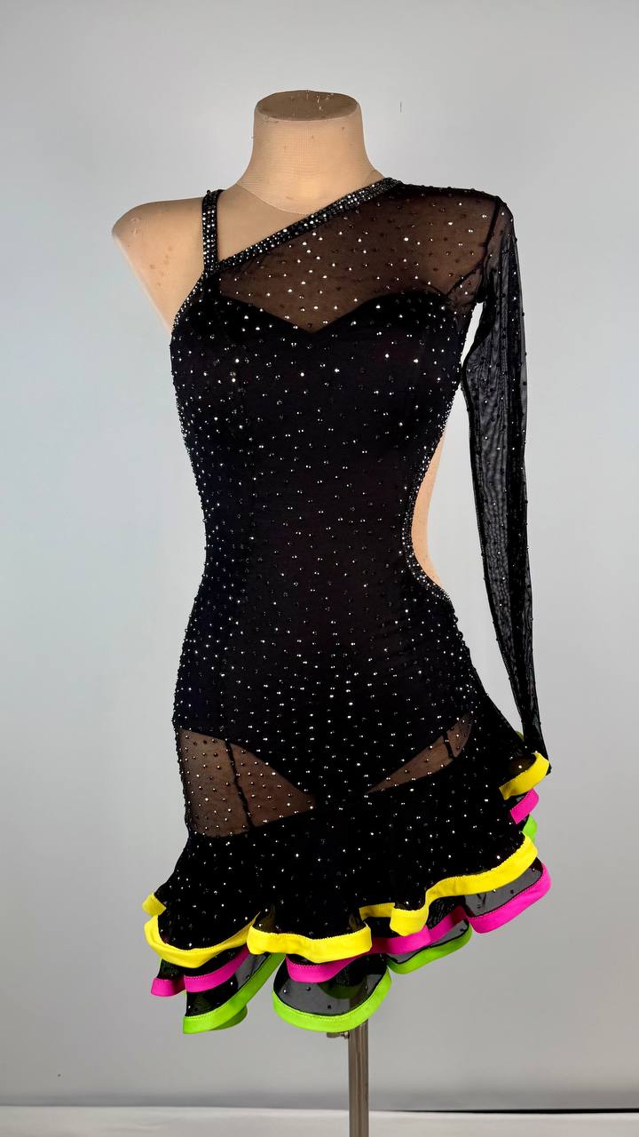 A flashy, like-new black latin dress, for small to medium sizes. Decorated with Swarovski stones, it's in excellent condition
