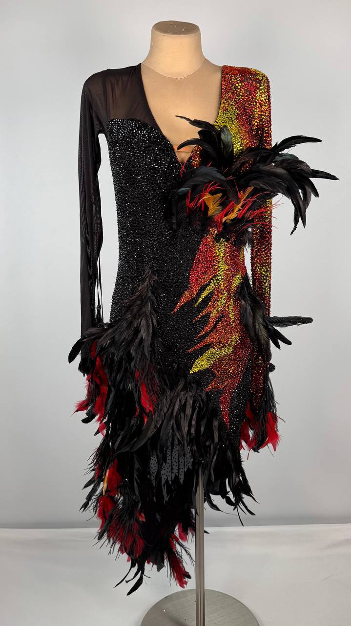 A lavish, like-new black and nude ballroom dress, for small to medium sizes. Made from Chrisanne fabric decorated with Feathers and Swarovski stones, it's in excellent condition