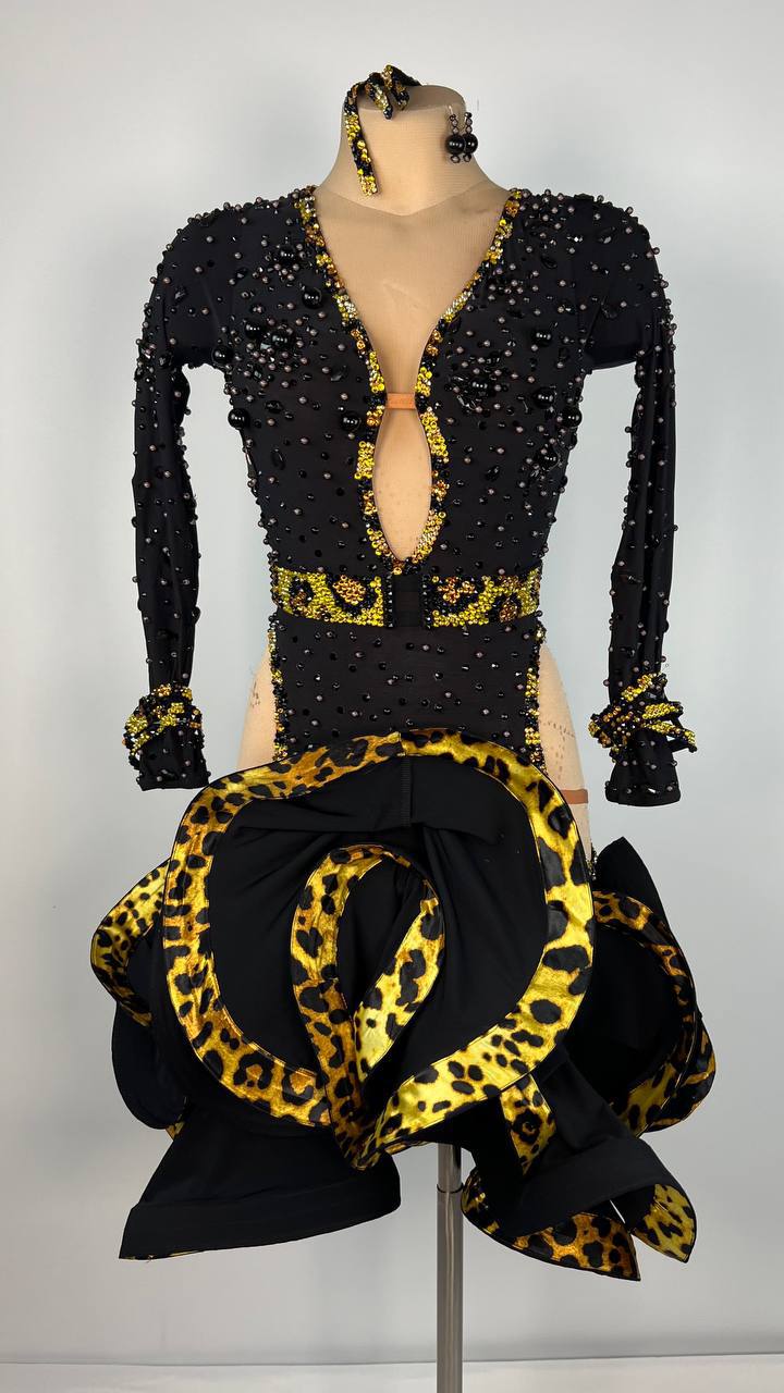 Unleash your inner wild side with the fierce and bold black and yellow cheetah print Latin/Rhythm dress from Grand Amour. Adorned with high-quality stones, this eye-catching design ensures you'll stand out on the dance floor with confidence and style. Perfect for dancers between 5'4" and 5'7", th...