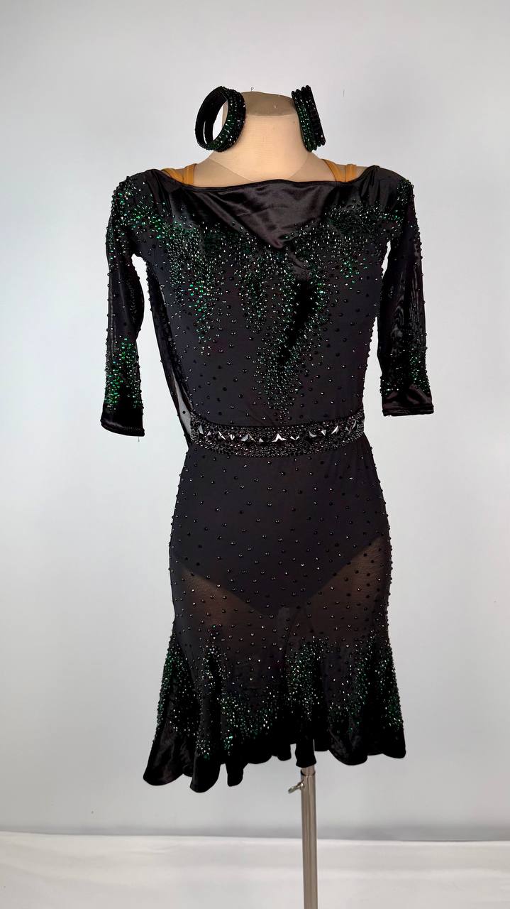 Embrace elegance with the Green Lady 👑 Smooth Dress, a stunning blend of sophistication and style. This used-like-new gown fits sizes M/L and is designed for dancers between 5’5” and 5’9”. Featuring a striking combination of black and green, it is crafted from luxurious mixed fabrics and adorned ...