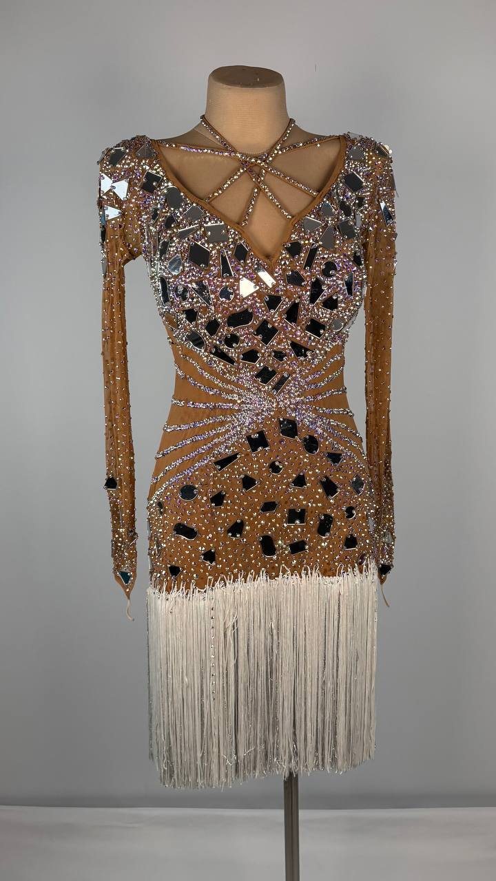 This stunning Silver Mirror 🪞 Latin/Rhythm Dress is a standout for dancers between 5'6" and 5'10". Featuring a sophisticated white and nude design, the dress is crafted with mixed fabrics and high-quality stones, offering a touch of elegance and shine. While the dress is in good used condition wi...