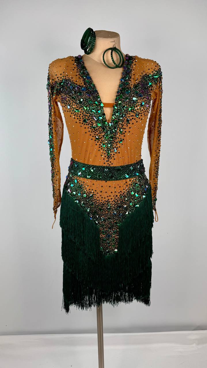 A sexy, like-new emerald green latin dress, for small to medium sizes. Made from mixed fabrics and stones, it's in excellent condition.