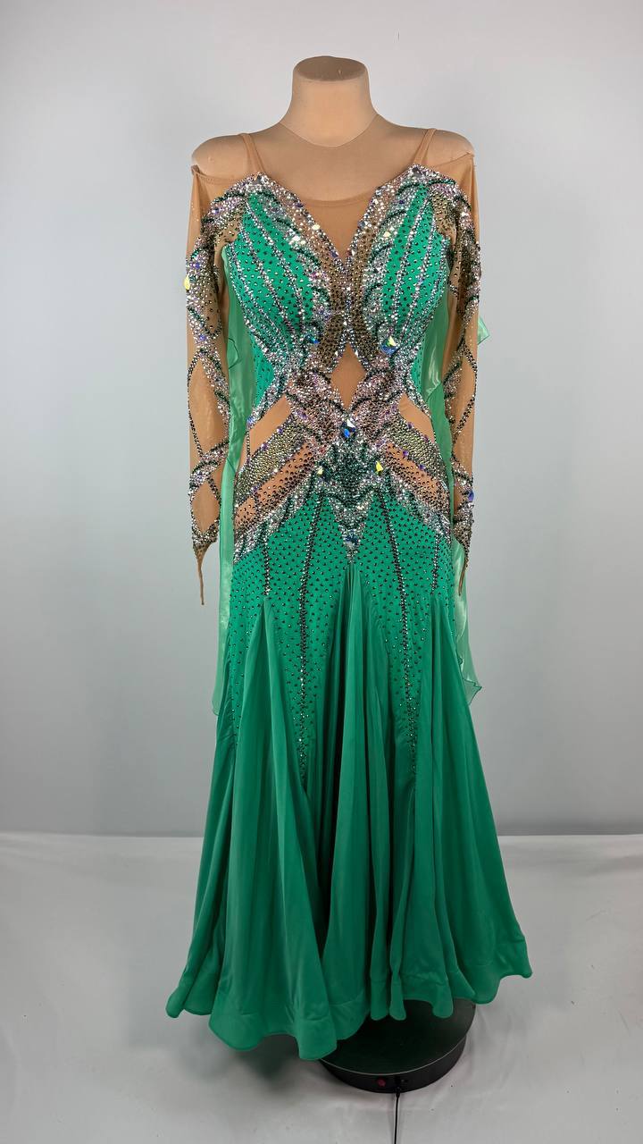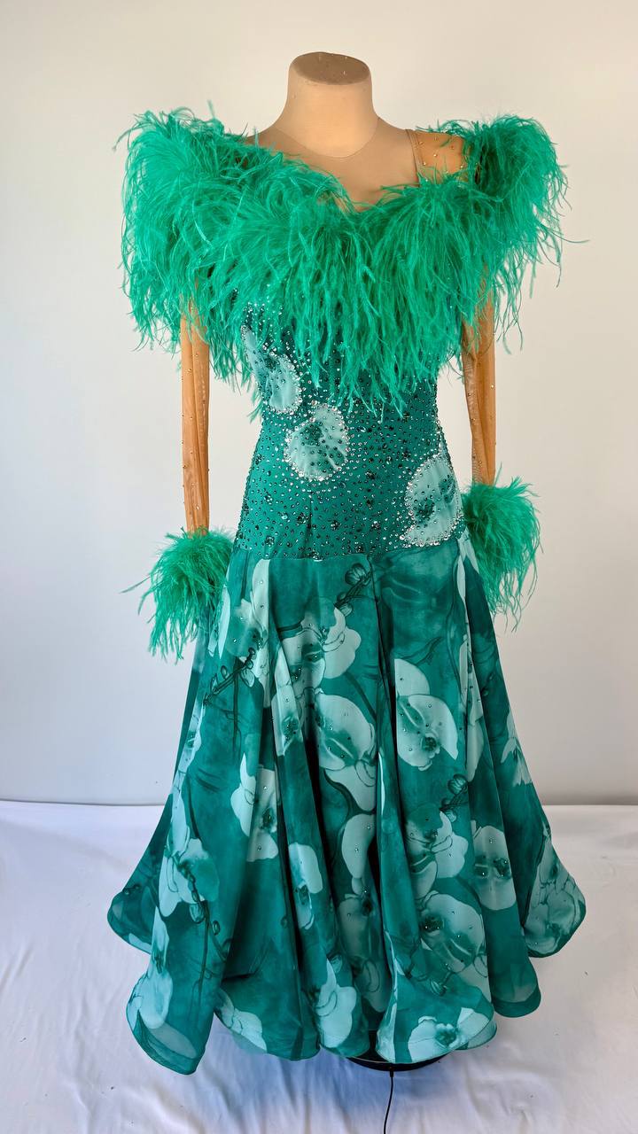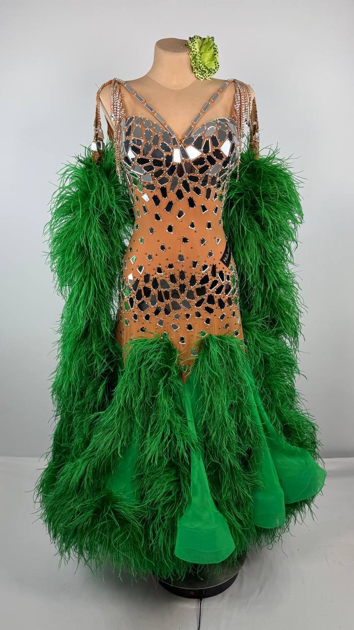 A classy, like-new green and gold smooth dress, for small to medium sizes. Made from Chrisanne fabric decorated with Feathers and Swarovski stones, it's in excellent condition