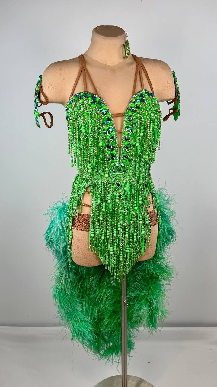 Vibrant • Bold • Glamorous Shine bright in the Emerald Blast 💥 Latin dress, a used-like new masterpiece that combines elegance with energy. Designed in green and gold, this dress sparkles with high-quality rhinestones and mixed premium fabrics, giving you a radiant look under every spotlight. Per...