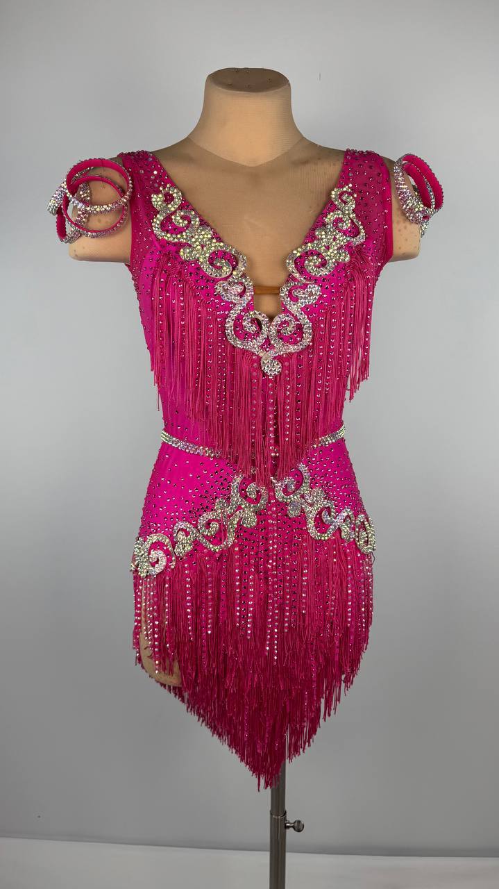 Radiate lively elegance in the bold and dazzling Pinky Fringes 💖 Latin/Rhythm dress. Crafted from high-quality mixed fabrics and embellished with sparkling stones, this vibrant pink creation catches the light with every movement, ensuring all eyes are on you. Tailored for dancers between 5'5" and...