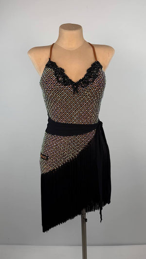 This stunning Black Net 🖤 Latin/Rhythm Dress is a sleek and mesmerizing choice for dancers between 5'5" and 5'9". Designed by the prestigious Flashdance brand, it features an all-black design with intricate net accents, crafted from premium mixed fabrics, and adorned with high-quality stones that sparkle brilliantly with every step. Brand new and never used, this size S/M dress combines elegance, mystery, and unmatched sophistication, making it the ultimate choice for your next Latin or rhythm performance. Price: $2,884.