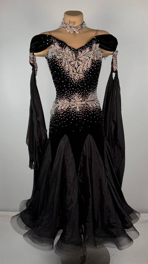This sophisticated Black Velvet 🖤 Ballroom Dress is a chic and timeless choice for dancers between 5'5" and 5'9". Featuring an elegant black and white design, this dress by GB is crafted from premium mixed fabrics and adorned with high-quality stones that add a touch of sparkle to your performance. In like-new condition, this size S masterpiece combines classic style, effortless grace, and ultimate comfort, ensuring you shine during your next ballroom event. Price: $1,648.