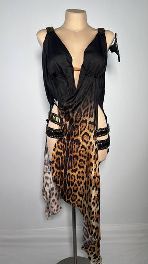 A showy, like-new black and cheetah latin dress, for small to medium sizes. Decorated with Swarovski stones, it's in excellent condition