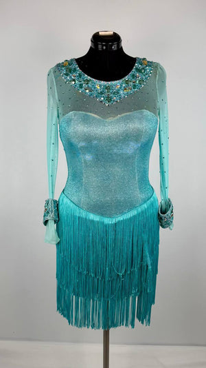 Sparkle with Magic in the Enchanting "Fairy Turquoise" Latin/Rhythm Dress đź§šUnleash grace, energy, and charm in this captivating turquoise Latin/Rhythm dress. Crafted from flowing mixed fabrics and adorned with dazzling rhinestones, this stunning gown shimmers with every movement, ensuring you light up the dance floor.