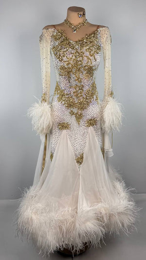 Radiate pure elegance in the luminous and enchanting Golden Lights ✨ ballroom dress by RS Italy 🇮🇹. Crafted from premium mixed fabrics and adorned with high-quality stones and delicate feathers, this white-and-gold masterpiece shimmers beautifully with every graceful turn, ensuring you captivate the audience’s attention.