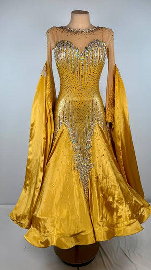 Radiate show-stopping glamour in this striking and sophisticated ballroom dress, Metallic Gold ✨, by AD 🇬🇧. Embodying boldness, brilliance, and elegance, this golden masterpiece is crafted from luxurious mixed fabrics and adorned with high-quality rhinestones that catch the light with every movement. In used-like new condition, it’s perfectly tailored for dancers between 5'2" and 5'6", offering a flawless fit for sizes S/M. With its dazzling shine and fluid design, Metallic Gold ensures you'll command attention and exude confidence with every step. Elevate your performance with this unforgettable look and let your presence glow with timeless allure.