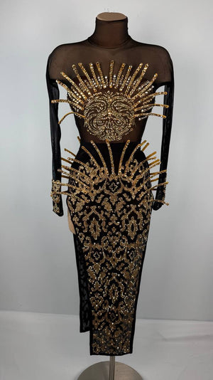 Shine with radiant power in the stunning Mighty Sunrays ☀️ Latin/Rhythm dress. Crafted from premium mixed fabrics and adorned with sparkling rhinestones, this striking black and gold masterpiece illuminates the dance floor with every movement, ensuring you captivate the audience's attention.
