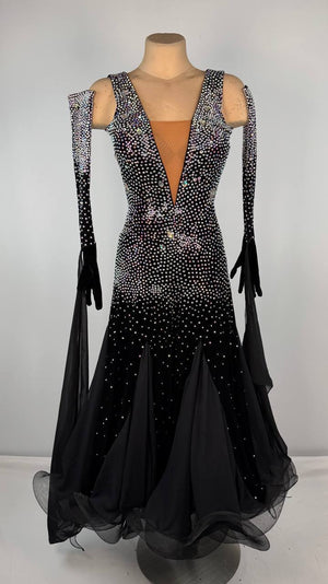 This enchanting Starry Night ✨ Ballroom Dress is a dazzling and sophisticated choice for dancers between 5'5" and 5'9". Designed by RS, this elegant black dress features premium mixed fabrics adorned with high-quality stones that sparkle like stars under the spotlight. In like-new condition, this size S dress combines timeless beauty, graceful movement, and exceptional comfort, ensuring you shine brilliantly during your next ballroom performance.
