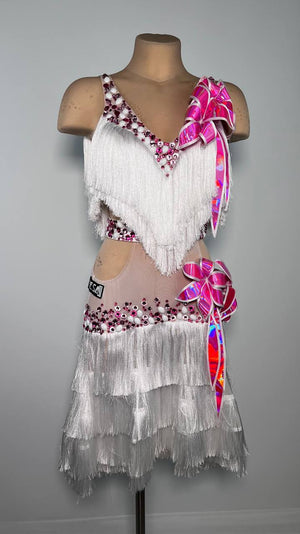 A stylish, used white and pink latin dress, for small to medium sizes. Decorated with Swarovski stones, it's in good condition.