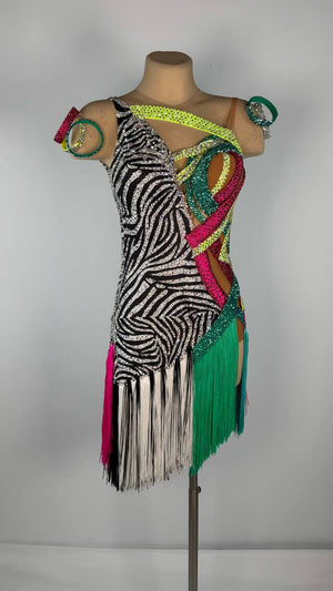 Embrace your wild side with the Zebra Vibe π¦ Latin/Rhythm Dress, a vibrant and unique creation designed to make you the star of the dance floor. This used-like-new dress fits sizes S/M and suits dancers between 5β5β and 5β9β. Featuring a striking zebra pattern enhanced with multicolored accents, it is crafted by Emelya Design using luxurious mixed fabrics and adorned with high-quality stones, ensuring a dazzling performance at every step.