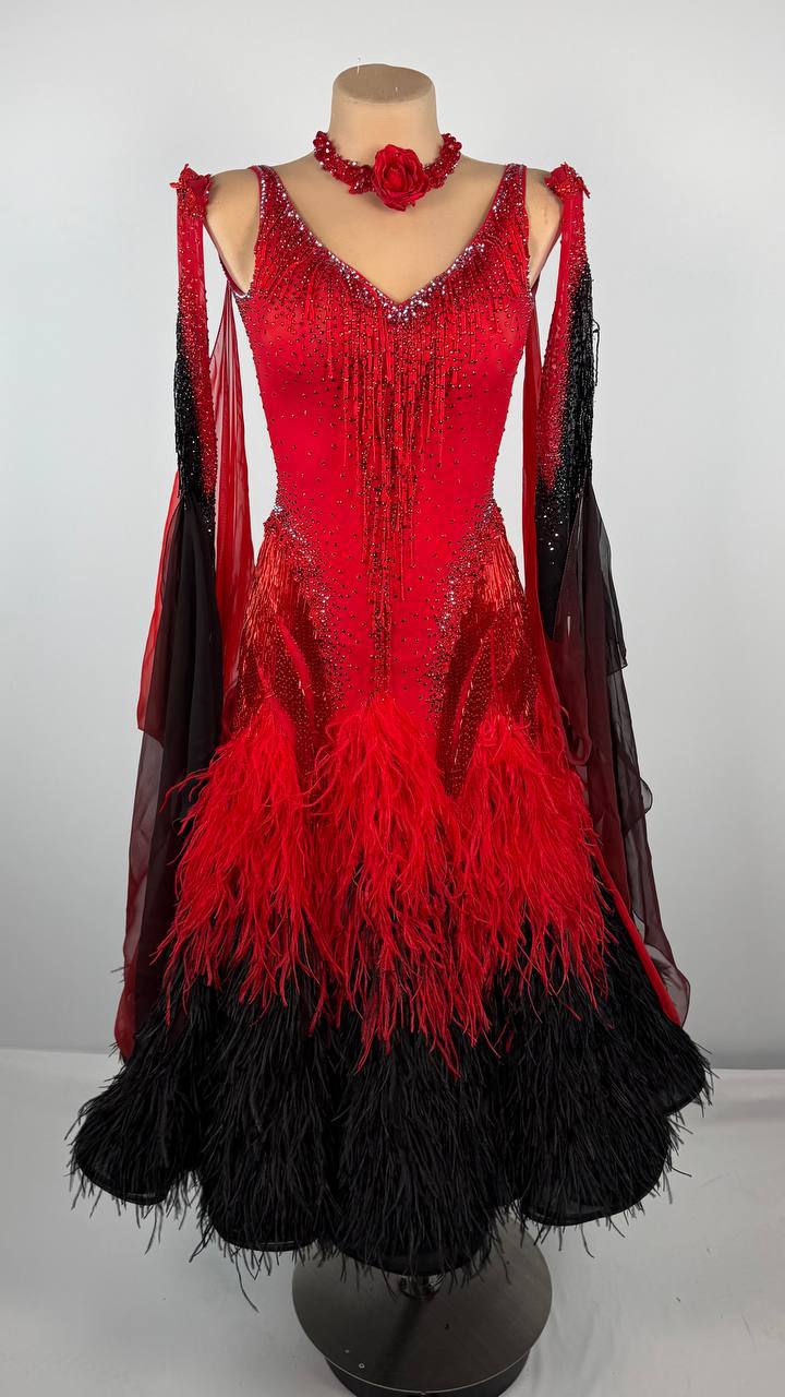 This fiery Tango Fire 🔥 Ballroom Dress is a bold and dramatic masterpiece for dancers between 5'4" and 5'7". Designed by EM Couture, this stunning red and black dress features luxurious mixed fabrics, high-quality stones, and elegant feather accents that add flair and movement to every step. In l...