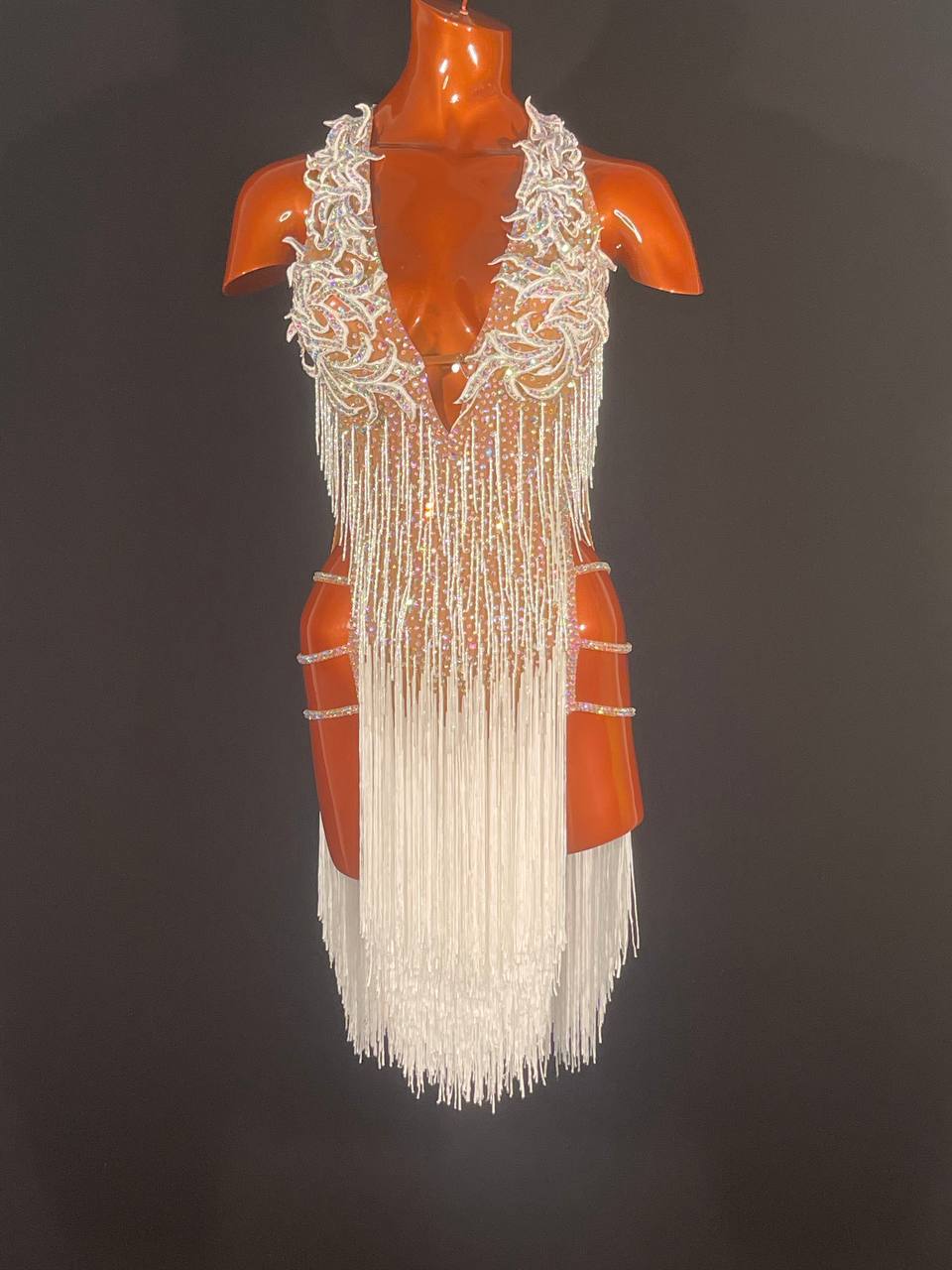 Radiate effortless charm in this dazzling Full Fringe 🤍 Latin/Rhythm Dress by Flashdance. Perfectly crafted for dancers who demand both style and performance, this white masterpiece is adorned with mixed fabrics and premium-quality stones, creating a show-stopping sparkle with every move. The ful...