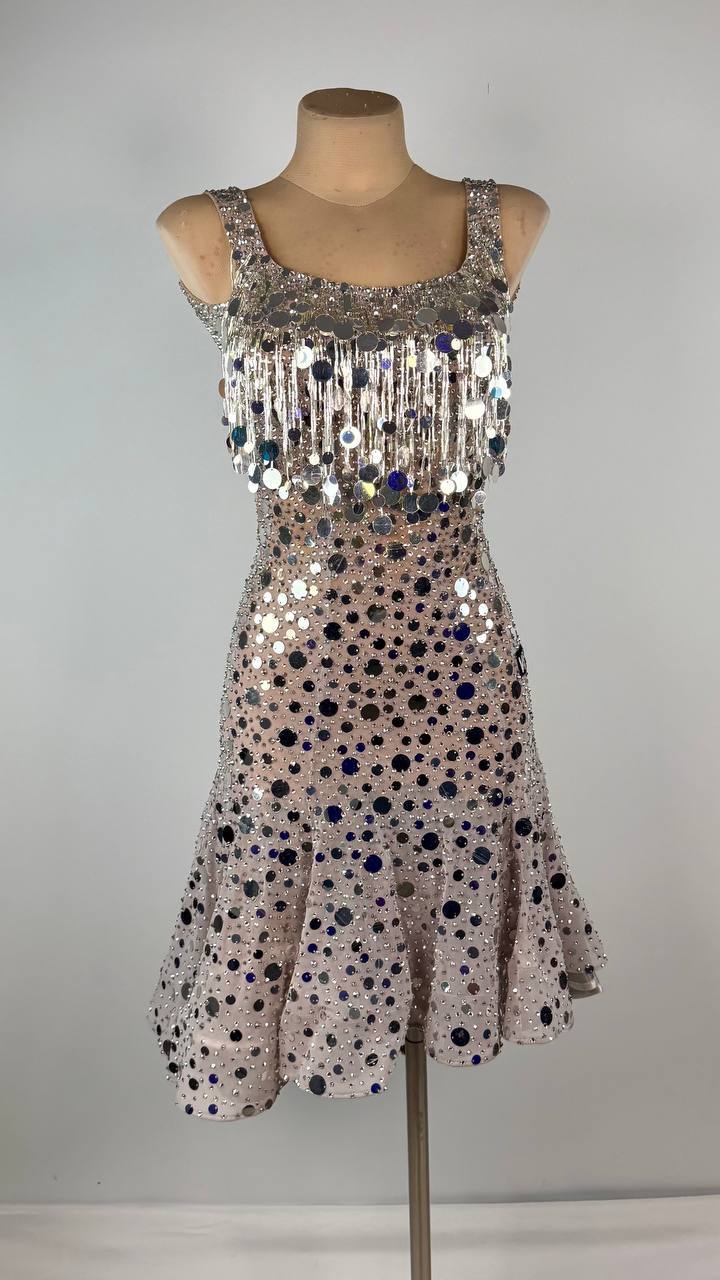 Shine bright under the spotlight in this sparkling, retro, and electric Disco Night 💿 – Latin/Rhythm Dress by VESA. With its light grey hue and dazzling high-quality stones, this dress brings vintage glamour into the modern dance floor. Expertly crafted from luxurious mixed fabrics, it flows with...