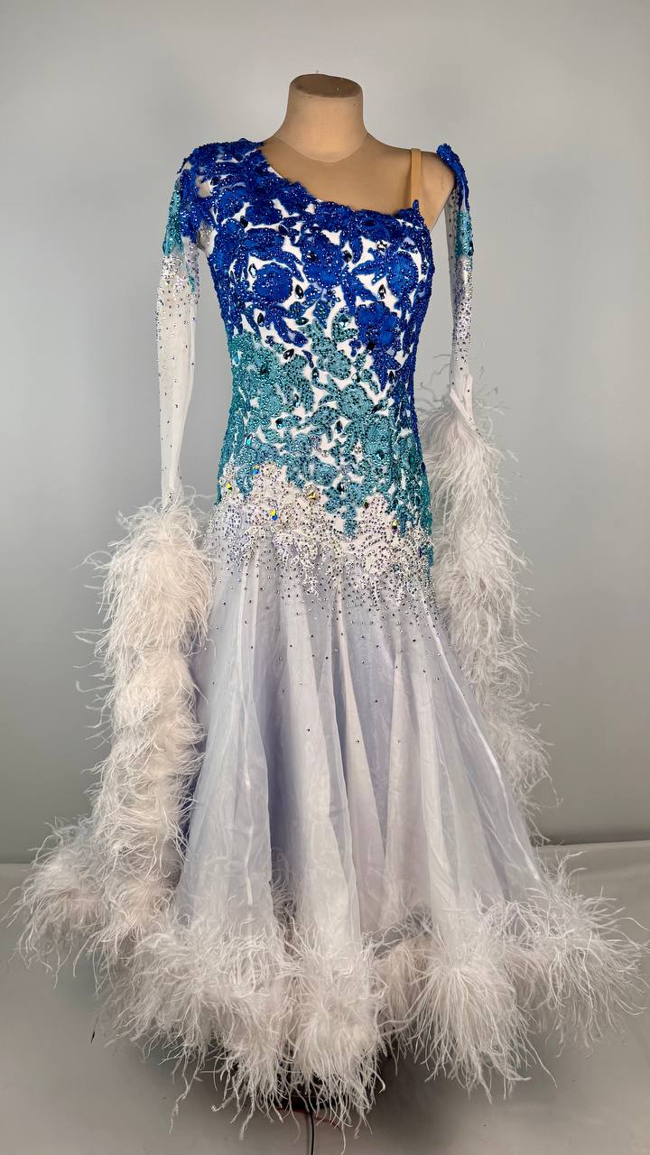 Radiate pure grace in the enchanting and elegant Light Sky 💙 ballroom dress by RS Italy 🇮🇹. Crafted from premium mixed fabrics and adorned with high-quality stones and delicate feathers, this white-and-blue masterpiece sparkles with every graceful movement, captivating the audience's attention. P...