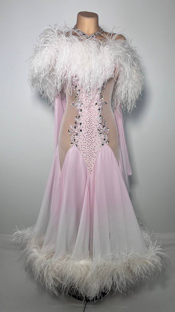 Radiate graceful elegance in this vibrant and enchanting Pink Feather Ballroom Dress by Altera. Crafted from premium mixed fabrics and adorned with high-quality stones and delicate feathers, this white and pink masterpiece shimmers beautifully with every step, ensuring you captivate the audience'...