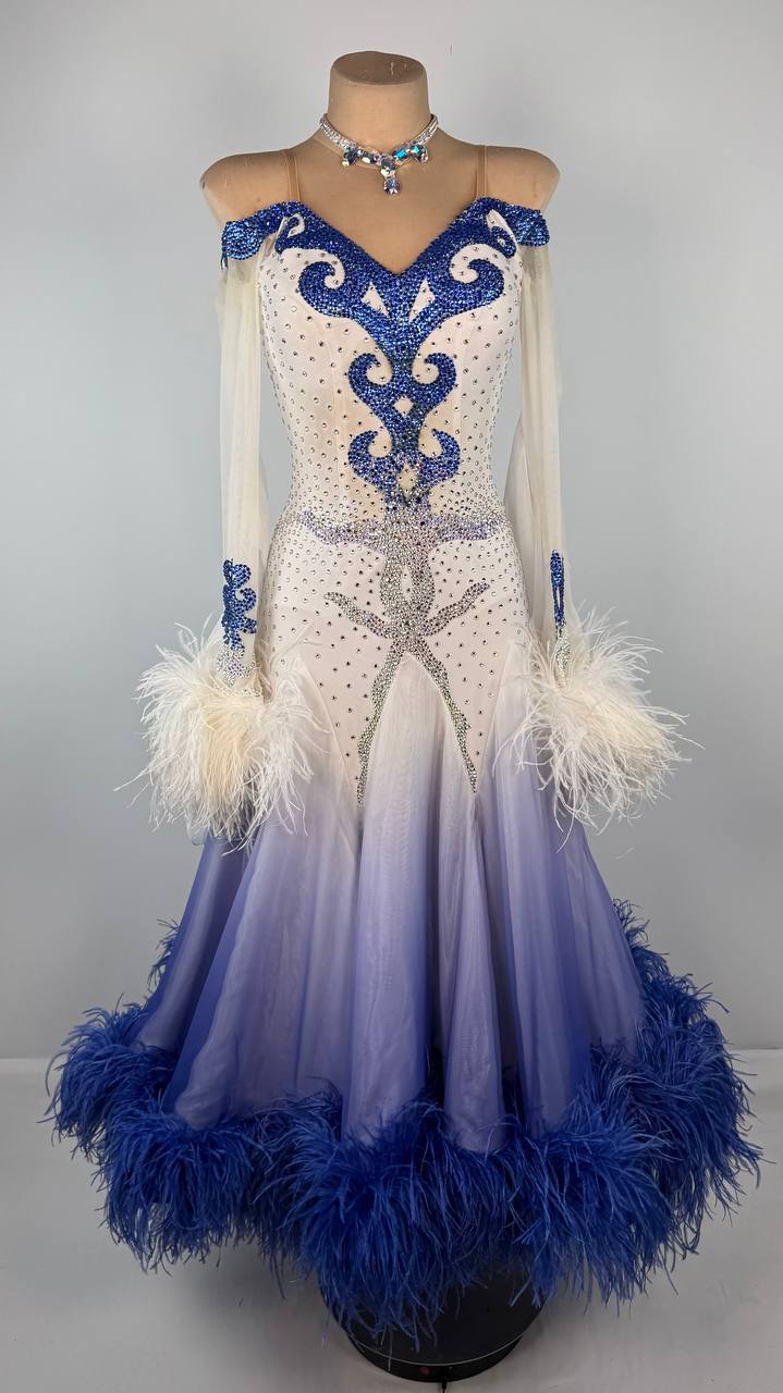 Cool. Elegant. Mesmerizing. Radiate pure sophistication in this stunning Blue Ice Ballroom Dress, a vision of grace and poise.Crafted from mixed fabrics and adorned with high-quality rhinestones, this breathtaking combination of blue and white glimmers beautifully with every movement, evoking the...