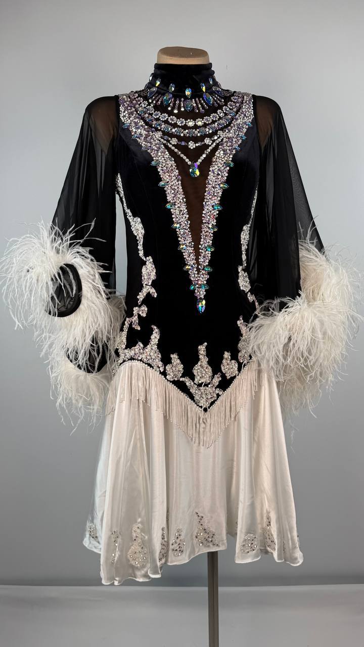 This sophisticated English Lady 🖤 Latin/Rhythm Dress is a timeless and elegant choice for dancers between 5'7" and 5'10". Featuring a classic black-and-white design, this dress is crafted from premium mixed fabrics and adorned with high-quality stones that add a touch of sparkle and refinement. I...