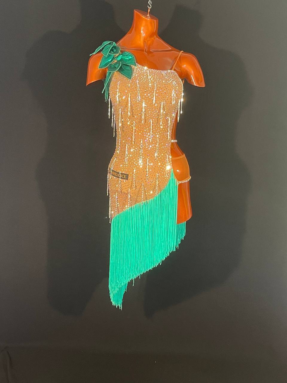Radiate natural elegance in the Green Leaves 🍃 Latin/Rhythm Dress by Flashdance. This stunning and graceful design features a unique blend of nude and green tones, creating a harmonious and captivating look. Crafted from mixed fabrics and adorned with high-quality stones, this dress shimmers with...