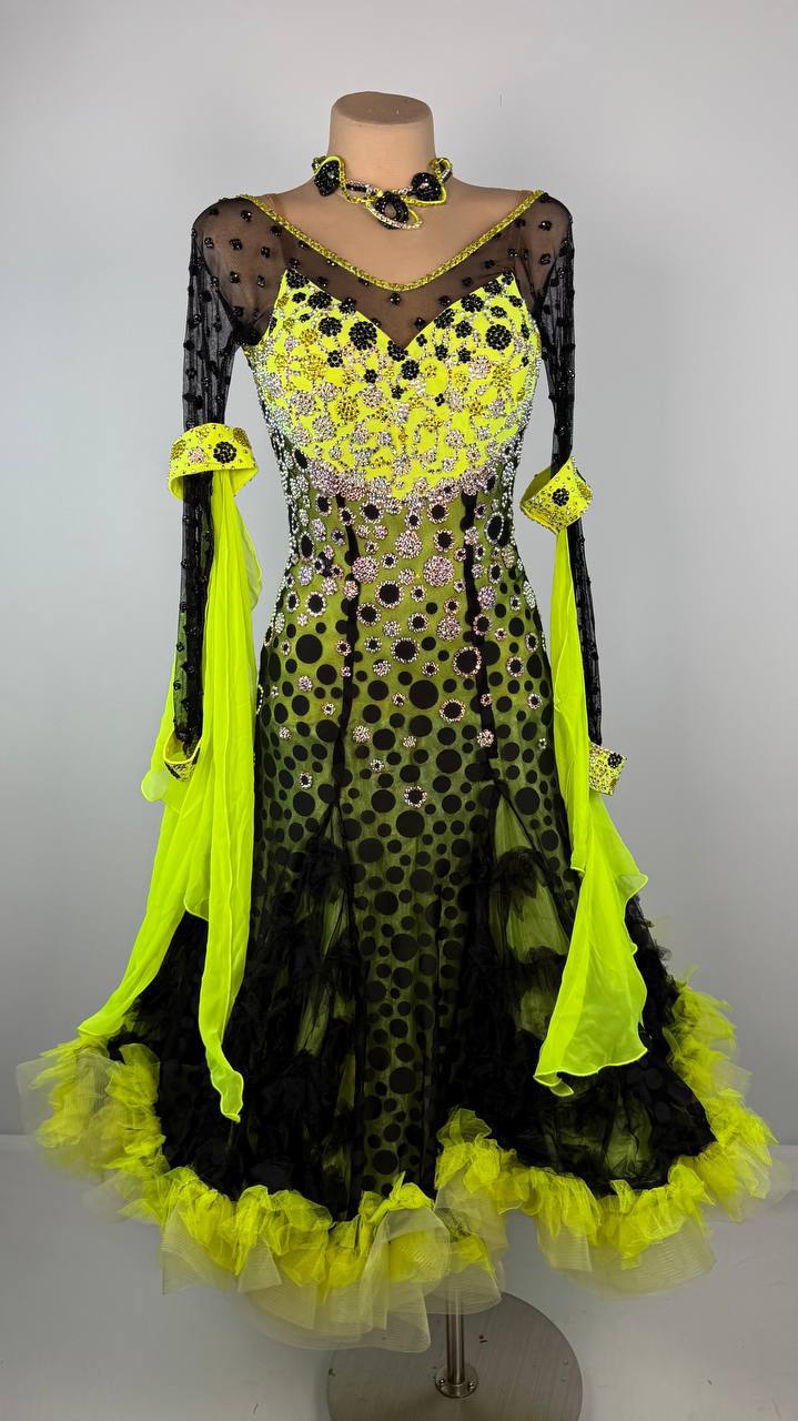 Embrace bold sophistication with the lively and captivating Lime Dots 🍋🟩 ballroom dress by RS Italy 🇮🇹. Made from premium mixed fabrics and embellished with high-quality stones and soft feathers, this lime-and-black creation shines with every elegant movement, ensuring all eyes stay on you. Desig...