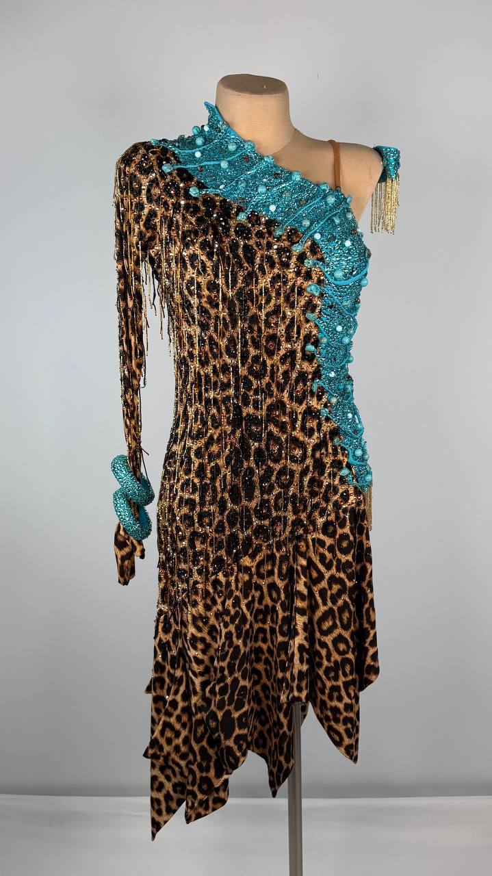 This striking Blue Cheetah 🐆 Latin/Rhythm Dress is a bold and dynamic choice for dancers between 5'6" and 5'10". Featuring a unique blend of cheetah print and shiny blue accents, this dress is crafted from premium mixed fabrics and adorned with high-quality stones that shimmer brilliantly with ev...