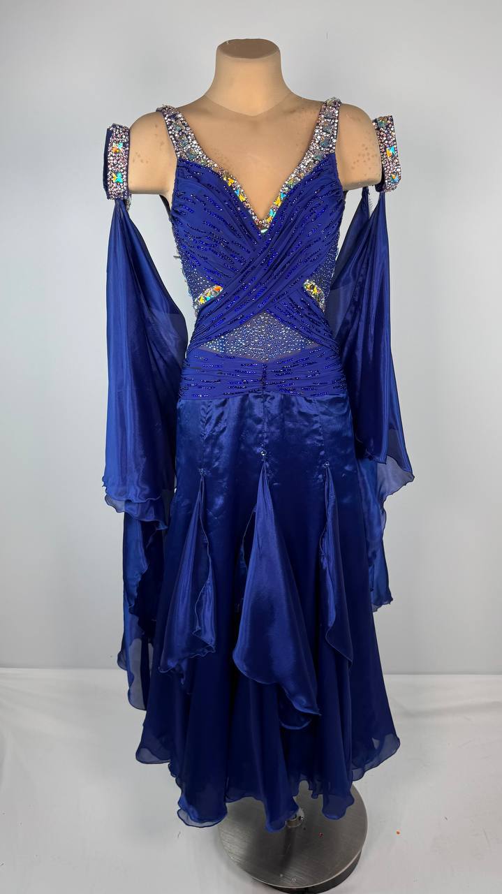 A stunning, like-new royal blue ballroom dress, for small to medium sizes. Made from mixed fabrics decorated with high-quality stones, it's in excellent condition.