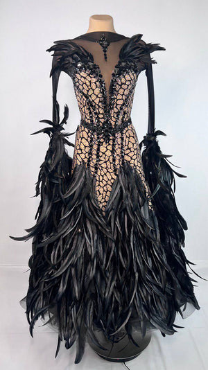 A lavish, like-new black and nude ballroom dress, for small to medium sizes. Made from Chrisanne fabric decorated with Feathers and Swarovski stones, it's in excellent condition