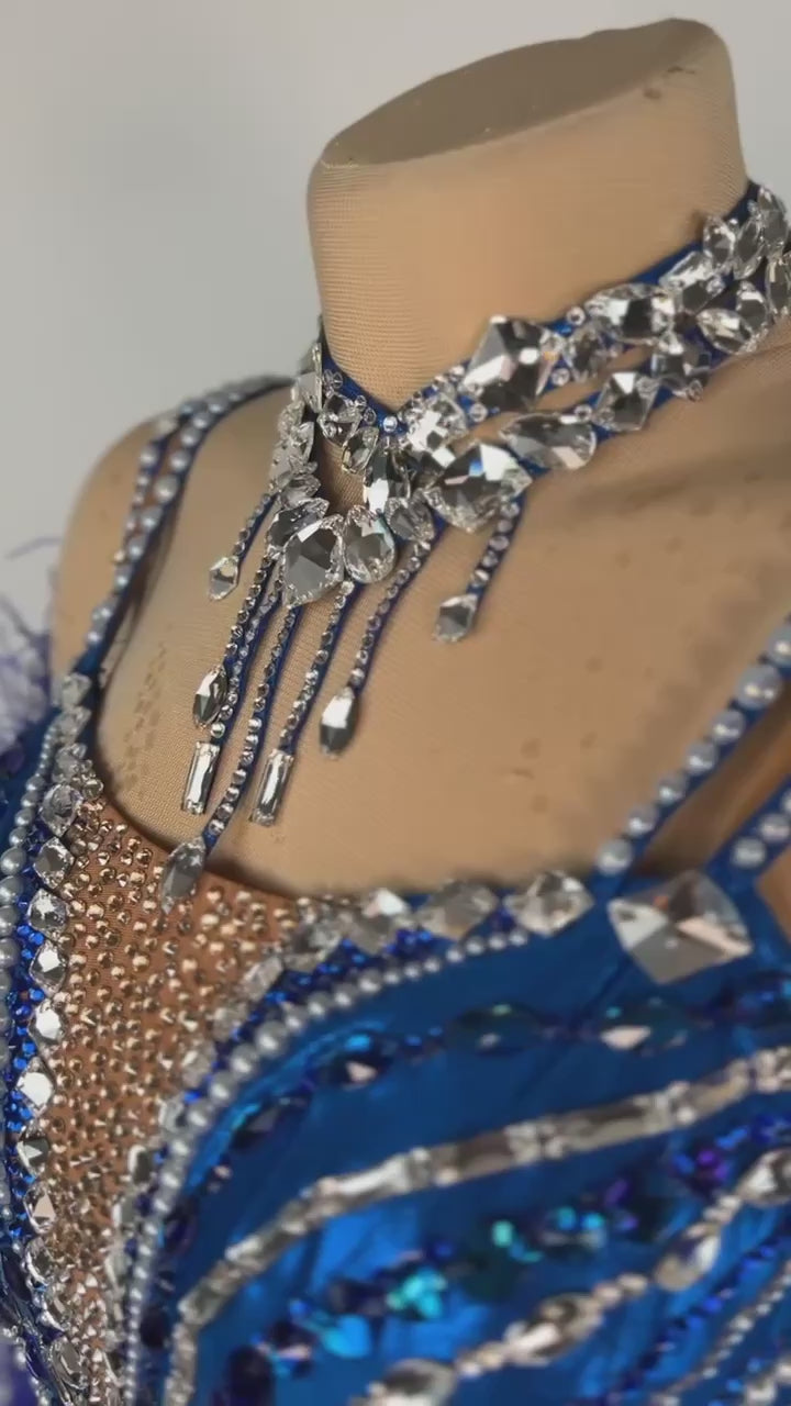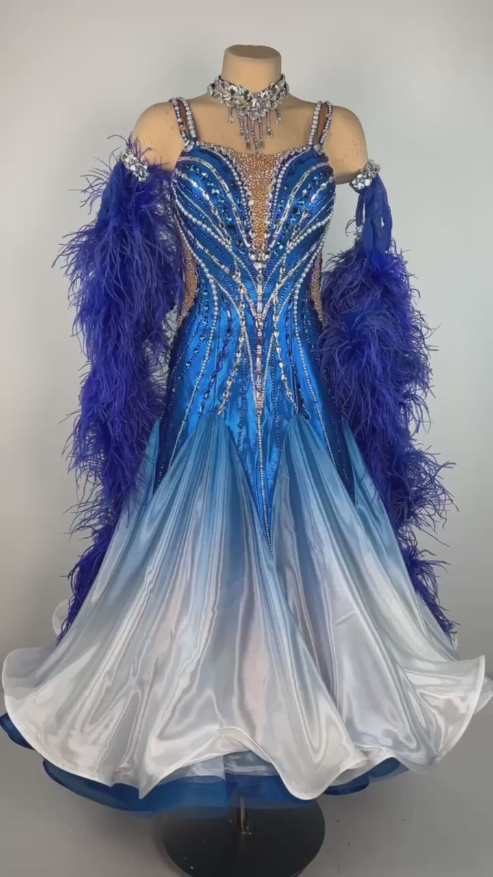 Step into the spotlight with this majestic and captivating ballroom dress from DanceDiscover FASHION. Featuring a striking blue design, this gown is adorned with high-quality stones and comes with a luxurious boa for an added touch of elegance and drama.