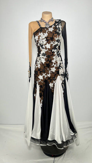 A lavish, like-new black and white ballroom dress, for large sizes. Made from mixed fabrics decorated with high-quality stones, it's in excellent condition. The floats on this dress are detachable and that makes this dress usable for both ballroom and smooth