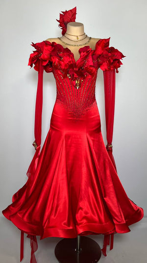 A vibrant, like-new light red and gold ballroom dress, for small to medium sizes. Made from Chrisanne Fabrics and decorated with hand made flower petals, it's in excellent condition.