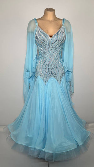 A classy, like-new sky blue ballroom dress, for small sizes. Made from mixed fabrics decorated with high-quality stones, it's in excellent condition.