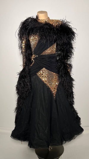 An elegant, like-new black and gold ballroom dress, for small to medium sizes. Made from Chrisanne Fabrics decorated with Feathers and Swarovski stones, it's in excellent condition.