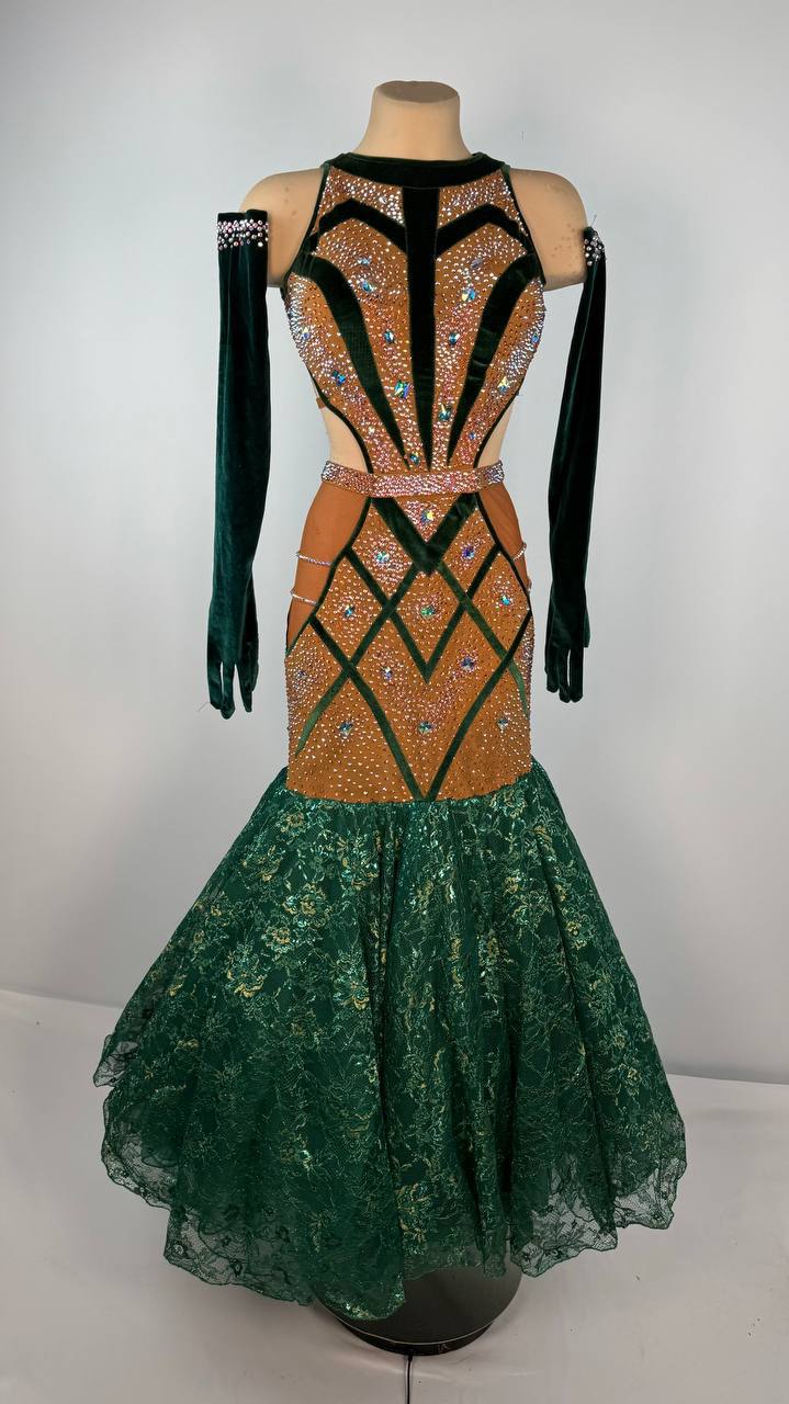 Cast a spell on the dance floor with the Green Witch 🧙 Smooth Dress, a bold and enchanting design for dancers who dare to stand out. This used-like-new gown fits sizes S/M and is tailored for heights between 5’5” and 5’9”. Featuring a mesmerizing blend of green and black, it is crafted from luxur...