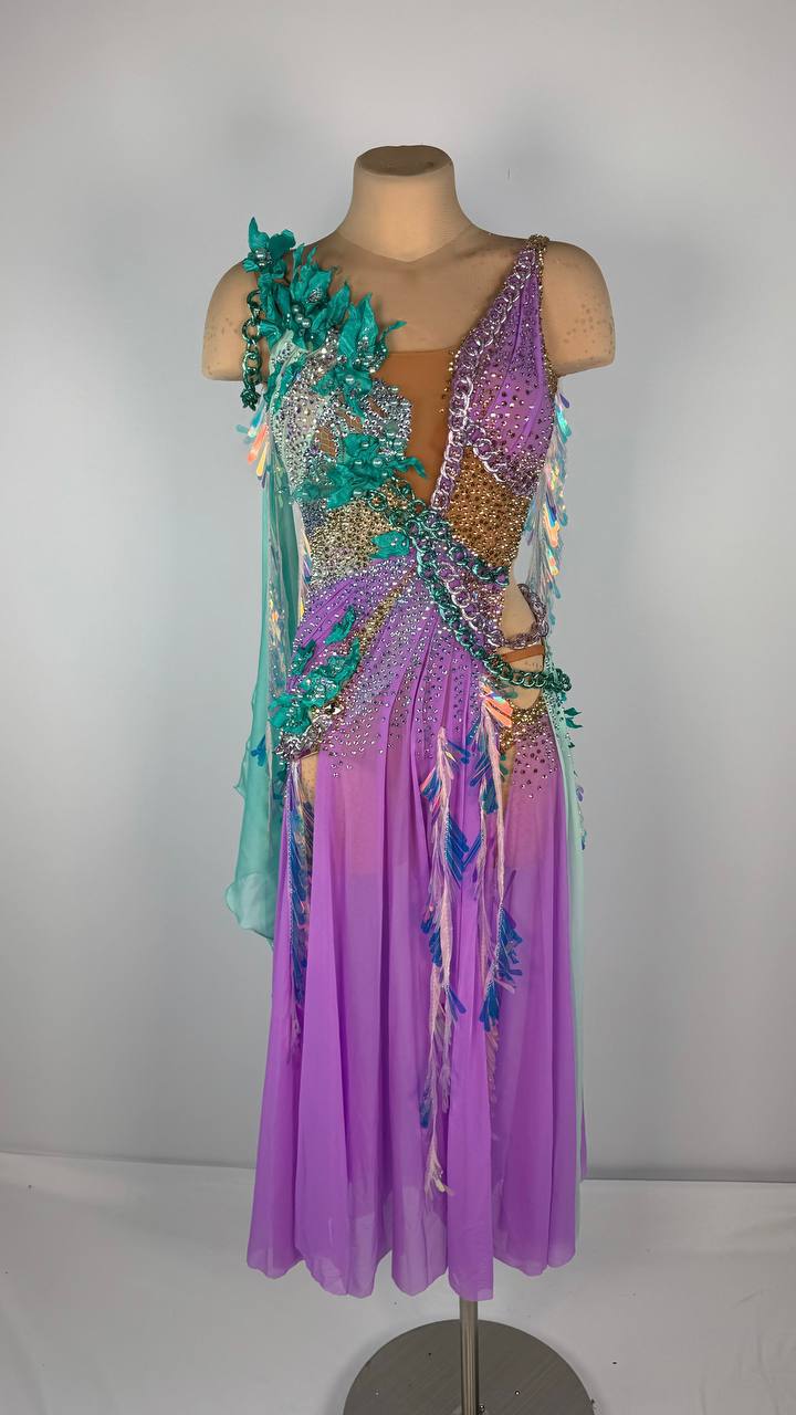 Dive into elegance with the Shiny Mermaid 🧜♀️ Smooth Dress, a dazzling creation that brings fantasy to life on the dance floor. This used-like-new gown fits sizes XS/S and is designed for dancers between 5’4” and 5’6”. Featuring a stunning blend of mint and purple, it is crafted by Emelya Design...