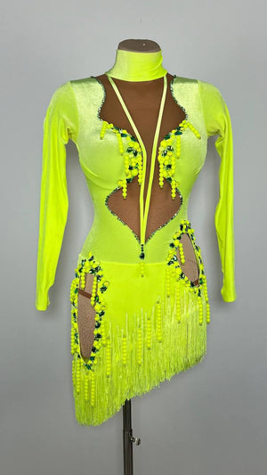 A vibrant, like-new yellow fluorescent latin dress, for small to medium sizes. Made from mixed fabrics and decorated with high-quality stones, it's in excellent condition