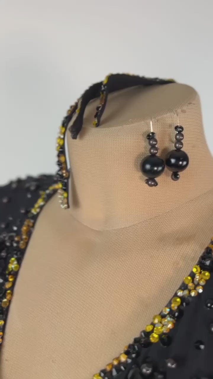 Unleash your inner wild side with the fierce and bold black and yellow cheetah print Latin/Rhythm dress from Grand Amour. Adorned with high-quality stones, this eye-catching design ensures you'll stand out on the dance floor with confidence and style.