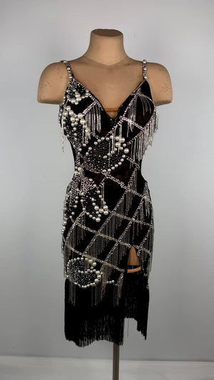 Exude grace, sophistication, and charm in this exquisite Latin Pearls ⚪️ dress by DORÈ. Designed in a striking black and white color palette, this Latin/Rhythm dress embodies timeless elegance with a modern edge. Crafted from premium mixed fabrics and adorned with dazzling high-quality rhinestones, it sparkles with every step, ensuring you captivate the audience's attention.
