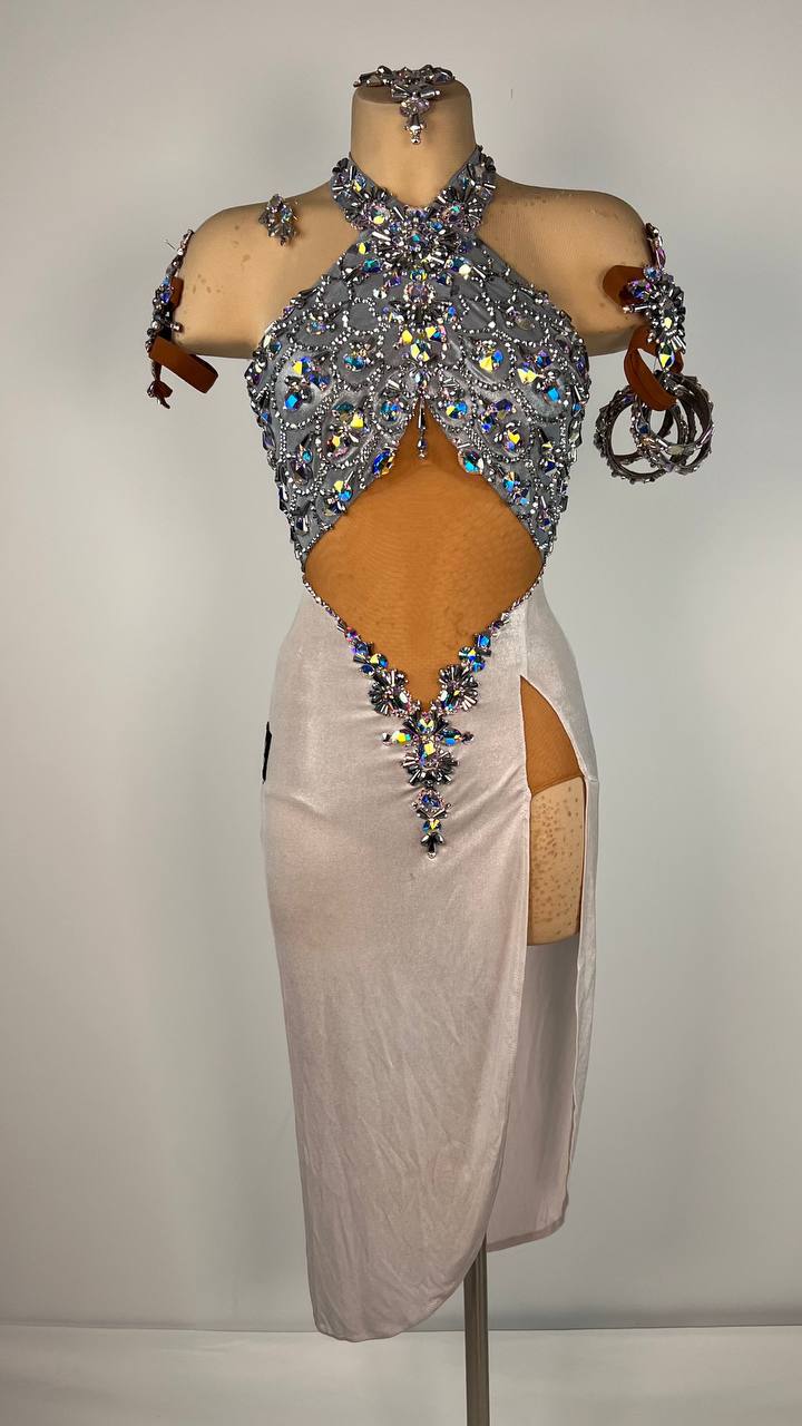 A sexy, like-new white latin dress, for small to medium sizes. Decorated with Swarovski stones, it's in excellent condition.
