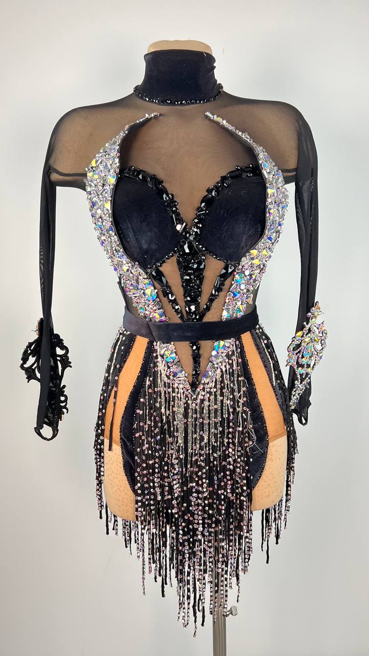 An alluring, like-new black latin dress, for small to medium sizes. Decorated with Swarovski stones, it's in excellent condition.