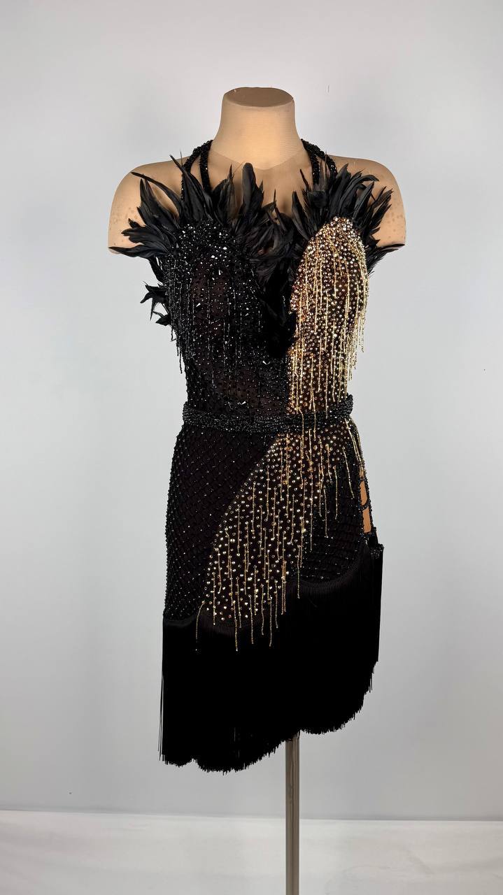 Soar with Confidence in the Bold "Golden Eagle" Latin/Rhythm Dress đŠ Â Command the floor with power, elegance, and grace in this striking black and gold Latin/Rhythm dress. Crafted from luxurious mixed fabrics and adorned with high-quality rhinestones, this masterpiece shines with every movement, c...
