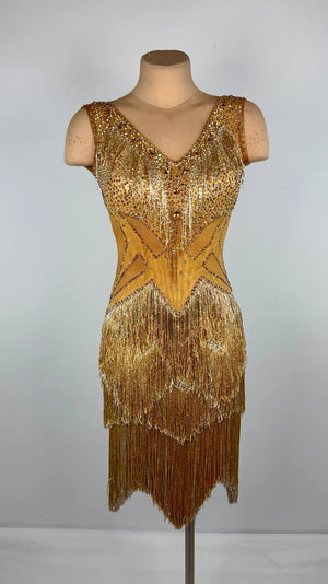 Shine with Brilliance in the "Golden Star" Latin/Rhythm Dress 🌟 Radiate elegance, sparkle, and poise in this stunning gold Latin/Rhythm dress. Crafted from luxurious mixed fabrics and adorned with high-quality rhinestones, this dress shines with every move, ensuring you captivate your audience and light up the floor.