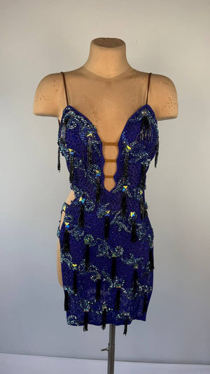 This Midnight Glam 🌃 Latin/Rhythm Dress is a show-stopping choice for dancers between 5'5" and 5'9". Designed by Dorè, its deep sapphire hue is crafted from premium mixed fabrics and adorned with dazzling high-quality stones. Exuding mystical sophistication, radiant allure, and bold elegance, this dress delivers exceptional comfort and style, ensuring you dazzle with every move. In used-like-new condition and perfect for size S, it's your ultimate choice to shine on the dance floor.